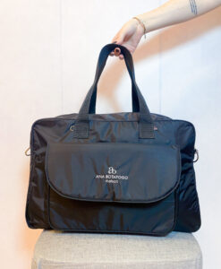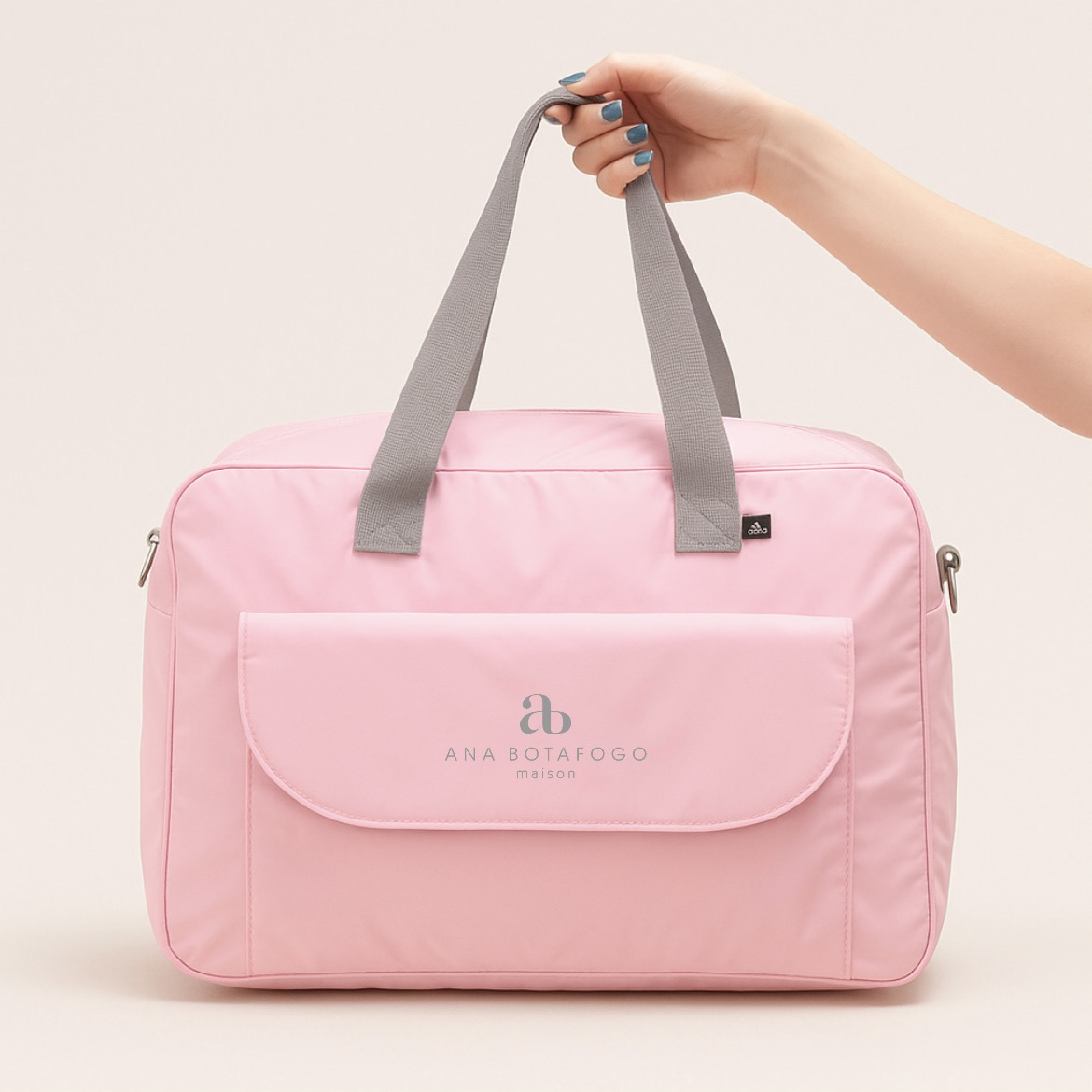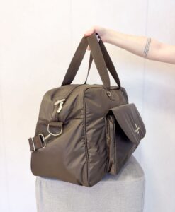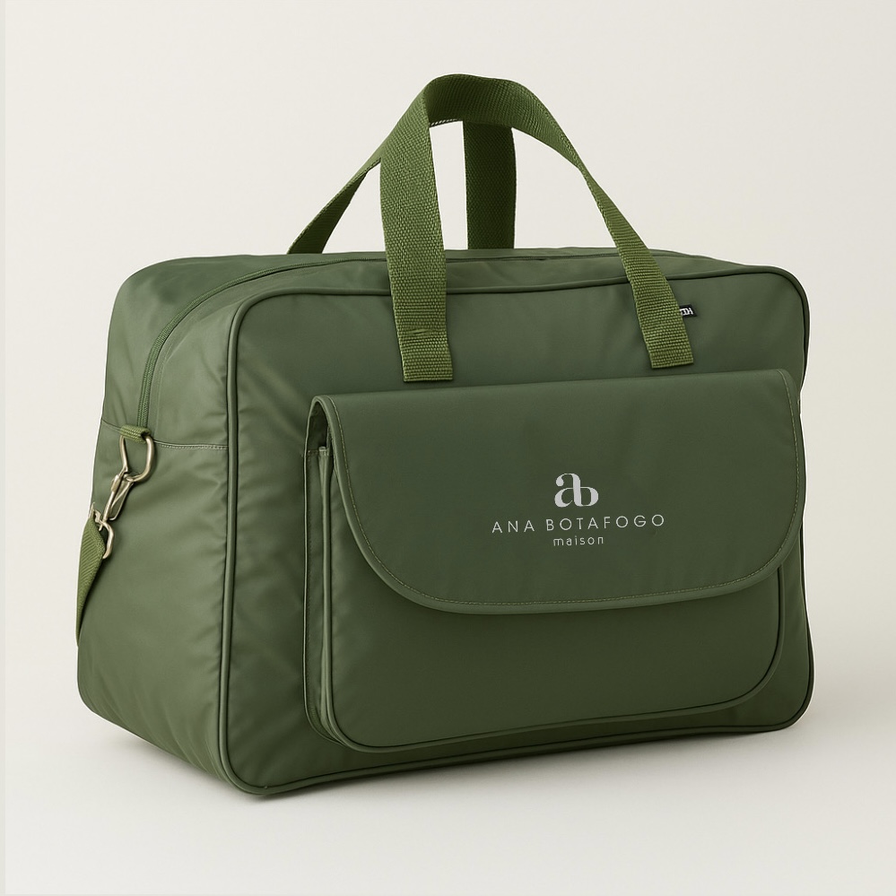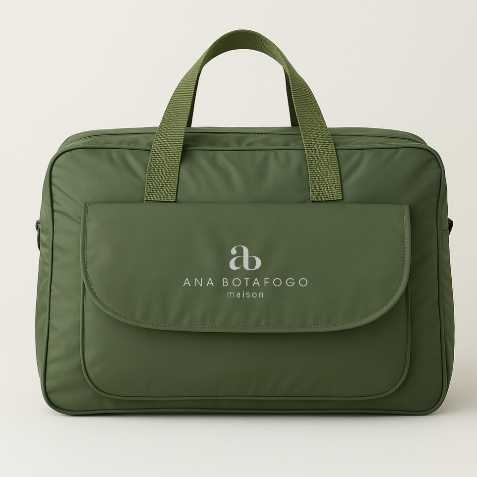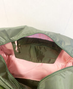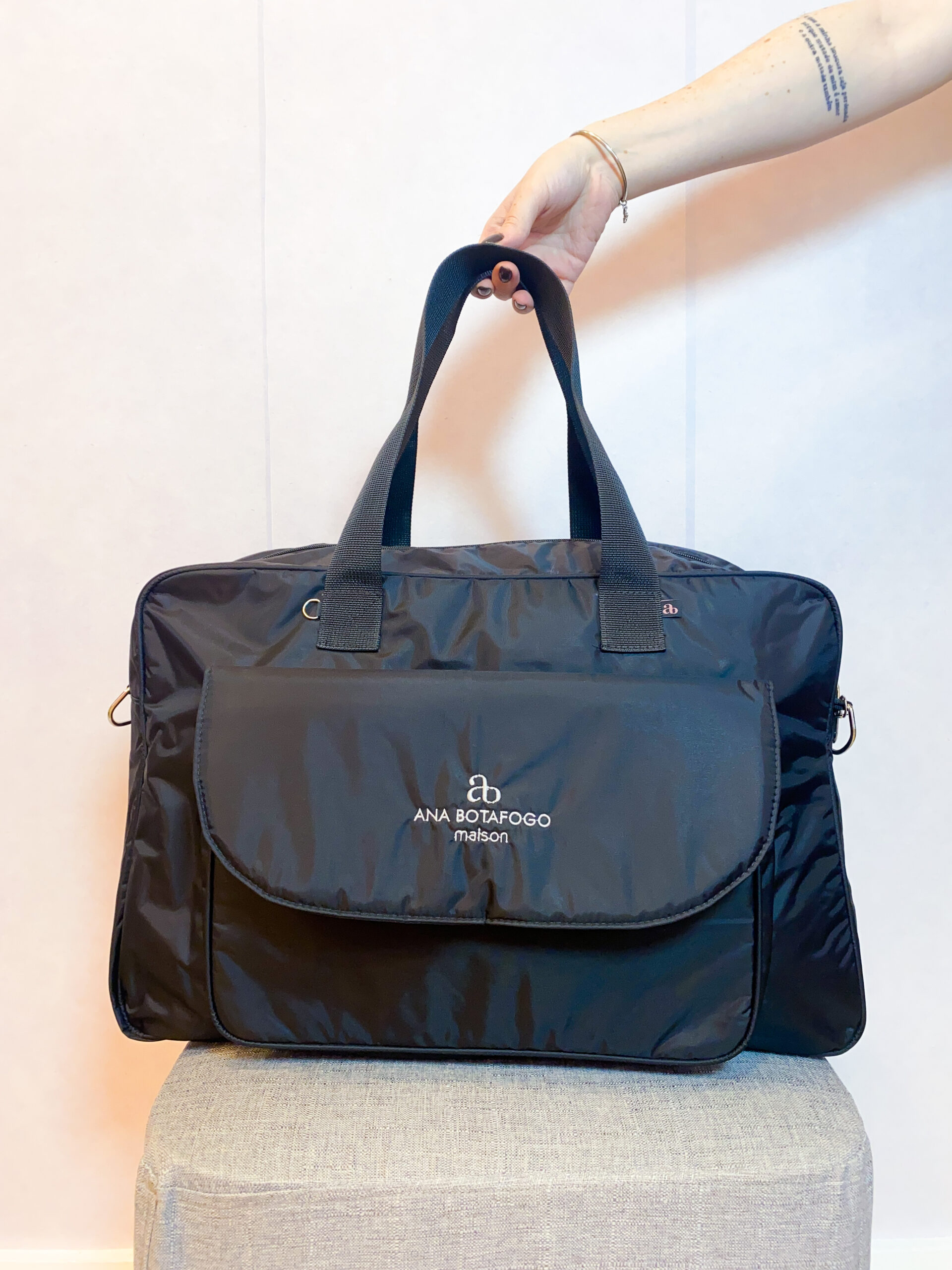 A bolsa possui 5 bolsos internos (sendo 1 com zíper) e duas opções de alças (ombro e transversal)