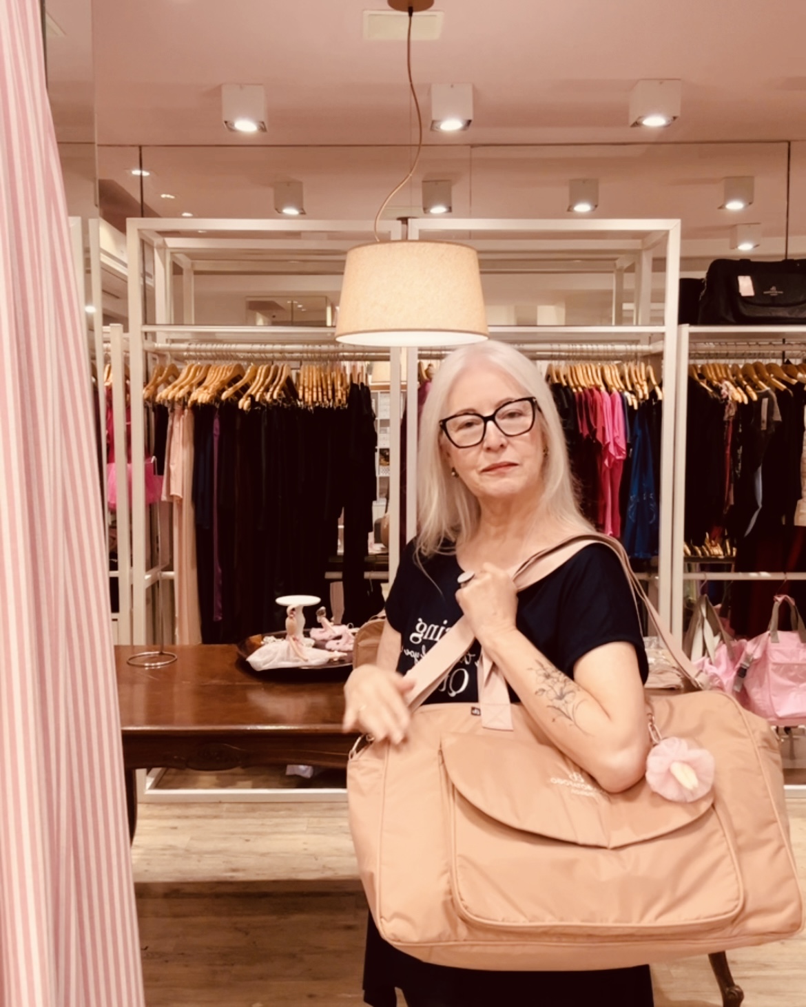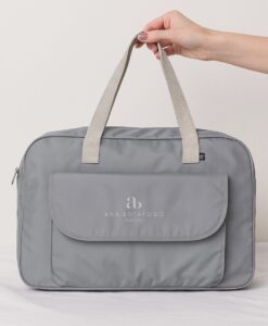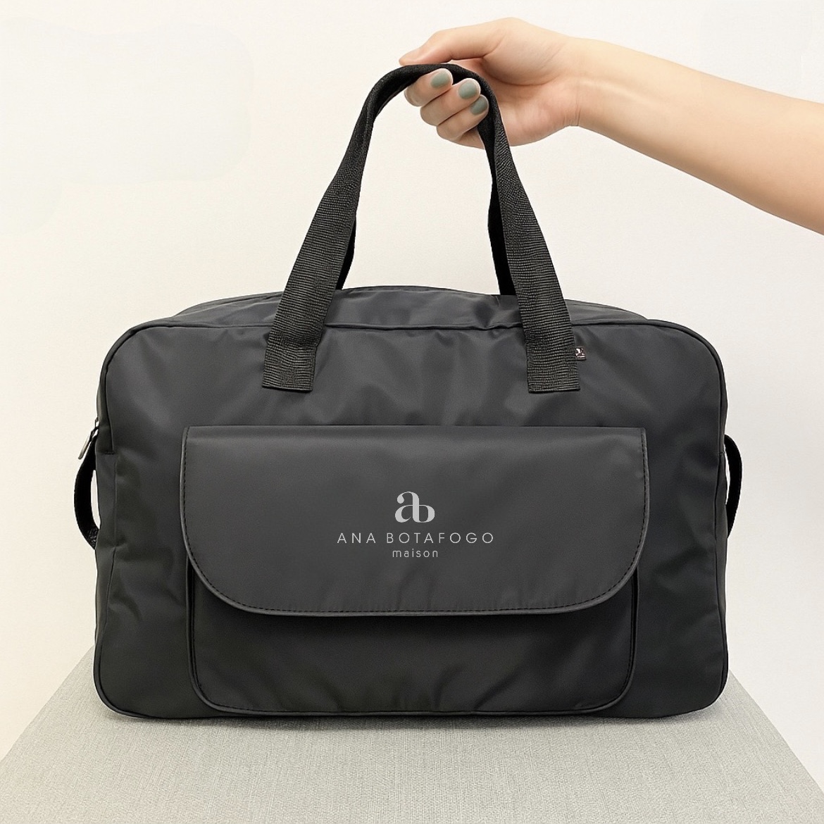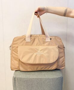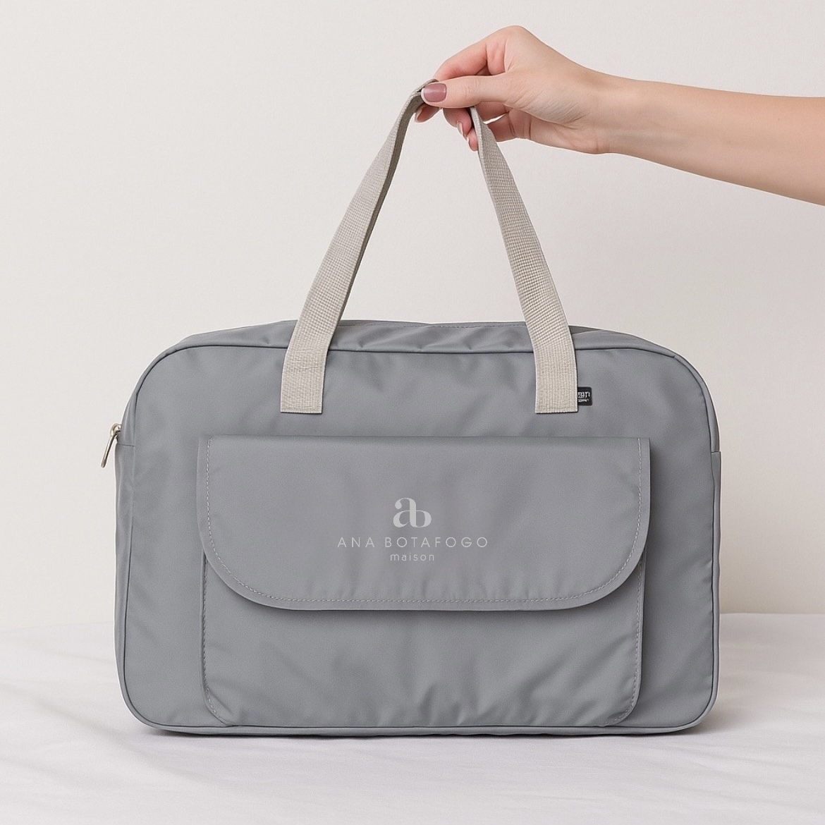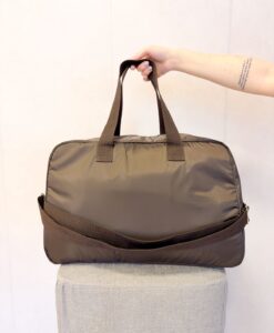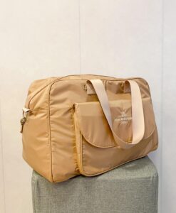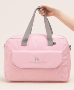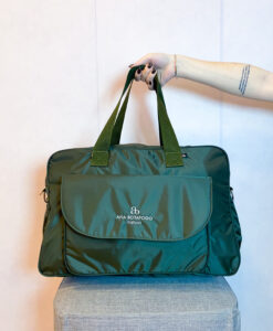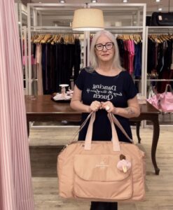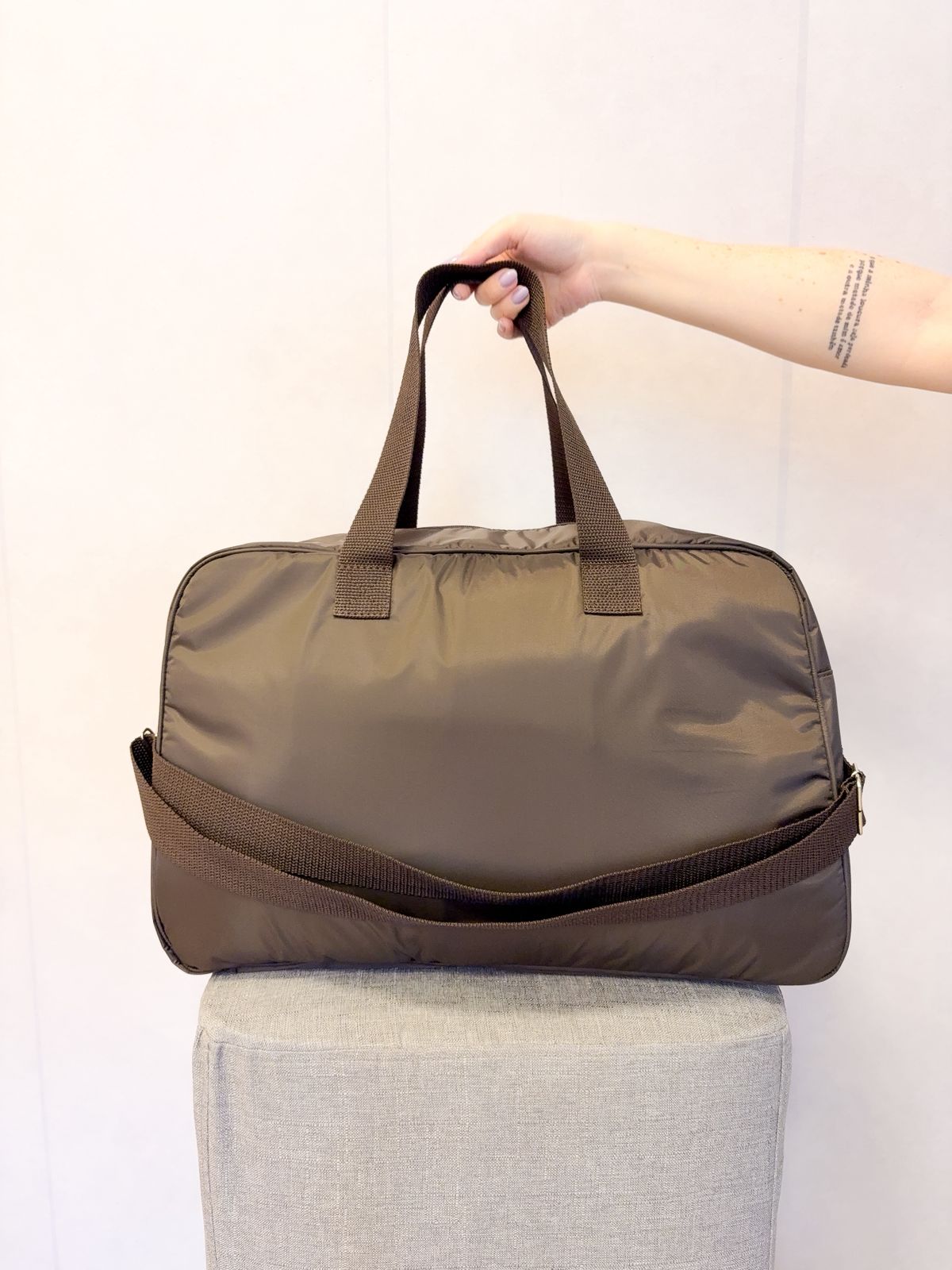 A bolsa possui 5 bolsos internos (sendo 1 com zíper) e duas opções de alças (ombro e transversal)